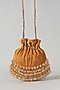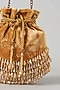 Featuring a gold oyster potli bag in velvet base with crystal work and hand beaded tassels, including embroidery. It has a shantoon lining, detachable chain, wristlet handle.