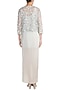 Featuring a grey bustier in raw silk base. It is paired with matching dhoti skirt in cotton satin base and net encrusted jacket having sequins embellishments.