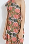 Featuring a pink and green dress in silk base with lotus print. It has one shoulder neckline.