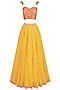 Featuring a marigold yellow lehenga in net with sequins, dabka, nalki, beads and resham embroidered motifs. It is paired with a coral peach frill strap blouse in crepe with embroidery and yellow embellished dupatta in net.