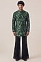 Featuring a green jacket in georgette and bombay silk base with floral tikki work. It is paired with a kurta and flared pants. Style it with mojaris for a festive occasion, mehendi, wedding celebration or sangeet ceremony.
