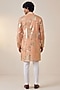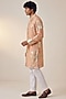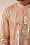 Featuring a pastel peach kurta in organza base with foil embellishments. Style it with pants and mojaris for a festive occasion, cultural event, wedding celebration or engagement ceremony.