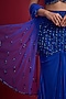 Featuring a blue draped lehenga in georgette base with hand embroidery. It is paired with a net embroidered blouse and a dupatta. Accentuate it with zircon jewellery, an embellished clutch bag and high heels for a wedding, cocktail, sangeet or reception ceremony.