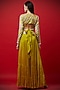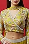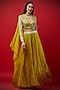Featuring a lemon yellow overlap blouse in tussar silk base with floral print and zardosi embroidery. It is paired with a matching gathered lehenga and dupatta in crepe silk base.