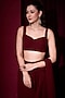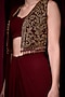 Featuring a maroon draped saree in georgette base. It is paired with a blouse and a velvet jacket. Accentuate it with statement jewellery, a clutch and high heels for a sangeet, cocktail or reception ceremony.
