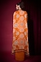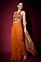 Featuring an orange draped skirt in georgette base. It is paired with a tissue embroidered blouse and a printed cape. Accentuate it with statement jewellery, a clutch and high heels for a sangeet, cocktail or reception ceremony.