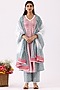 Featuring an aqua blue pintuck anarkali in cotton cambric base with block print and hand embroidery. It is paired with matching palazzo pants and a dupatta.