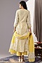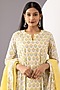 Featuring an ivory A-line kurta in cotton base with hand block print. It is paired with contrasting yellow khadi printed palazzo pants and a cotton mulmul dupatta having block print and lace detailing.