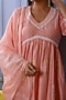 Featuring a pink kurta in chanderi base with foil print and lace work. It is paired with matching cotton palazzo pants having block print and a dupatta.