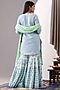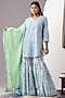 Featuring a powder blue short kurta in cotton base with block print and lace detailing. It is paired with matching printed gharara pants and a mulmul block printed dupatta.