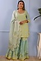 Featuring a sea green kurta in cotton silk base with hand block print and lace work. It is paired with matching gharara pants having foil print and a viscose stripe organza dupatta. Perfect wear for festive occasions or wedding ceremonies.