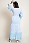 Featuring a white and blue gathered maxi dress in cotton cambric base with block print and flared sleeves.
