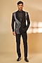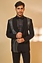 Featuring a black tuxedo in japanese rayon base with beads and cutdana handwork. It is paired with a pintuck shirt, trousers and a bowtie. Style it with shoes for a regal, traditional look, perfect for a reception, cocktail or engagement ceremony.