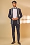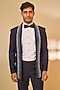 Featuring a blue tuxedo in japanese rayon base with beads and pearl handwork. It is paired with a shirt, trousers and a bowtie. Style it with shoes for a regal, traditional look, perfect for a reception, cocktail or engagement ceremony.