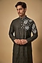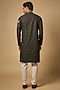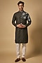 Featuring a green kurta in cotton silk blend base with mandarin collar, print, zari embroidery. It is paired with off-white japanese rayon trousers. Style it with mojaris for a festive occasion, cultural event, wedding, mehendi for engagement ceremony.