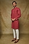 Featuring a red kurta in cotton base with sequins and chikankari embroidery. It is paired with contrasting white terry rayon trousers.