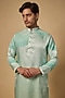 Featuring a sea green kurta in linen silk base with beads and thread embroidery. It is paired with off-white japanese rayon trousers. Style it with mojaris for a festive occasion, cultural event, wedding, mehendi for engagement ceremony.