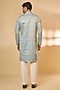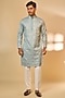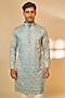 Featuring a sea green kurta in malai cotton base with resham thread machine embroidery. It is paired with off-white japanese rayon trousers. Style it with mojaris for a wedding, mehendi, sangeet or engagement ceremony.