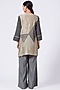 Featuring a nude textured top in silk base with ace embroidery. It is paired with contrasting grey handloom pants.