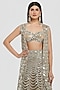 Abhinav Mishra presents a champagne gold lehenga crafted in net base with mirror, zari and gota work. It is paired with a blouse and a jacket. Adorn this refined silhouette with diamond accents, dewy sculpted makeup and a graceful braided hair style for understated sangeet elegance.