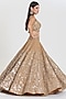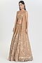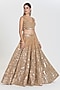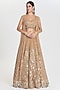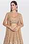 Featuring a gold lehenga in net base with dori, zari, mirror, thread and sequins embroidery. It is paired with a blouse and a dupatta. Style it with statement jewelry and heels for weddings or sangeet ceremonies.