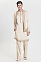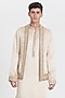 Featuring a beige bundi jacket in chanderi base. It is paired with a kurta and pants. Style it with mojaris for a festive occasion, reception, wedding or engagement ceremony.