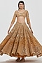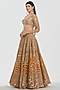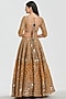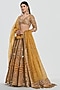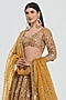 Abhinav Mishra presents a mustard yellow lehenga crafted in net base with mirror, zari and gota work. It is paired with a chanderi blouse and an organza dupatta. Adorn this refined silhouette with polki accents, dewy sculpted makeup and a graceful braided hair style for understated haldi elegance.