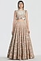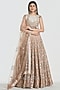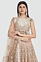 Abhinav Mishra presents a peach lehenga crafted in net base with mirror, zari and gota work. It is paired with a blouse and a dupatta. Adorn this refined silhouette with diamond accents, dewy sculpted makeup and a graceful braided hair style for understated sangeet elegance.