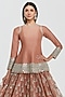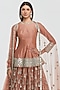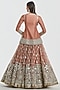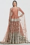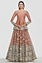 Abhinav Mishra presents a peach salmon lehenga crafted in net base with mirror, zari and gota work. It is paired with a chanderi peplum and a net dupatta. Adorn this refined silhouette with diamond accents, dewy sculpted makeup and a graceful braided hair style for understated sangeet elegance.
