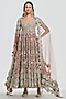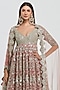 Abhinav Mishra presents a powder pink anarkali crafted in net base with mirror, zari and gota work. It is paired with a dupatta. Adorn this refined silhouette with diamond accents, dewy sculpted makeup and a graceful braided hair style for understated sangeet elegance.