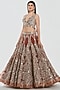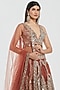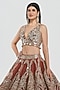 Abhinav Mishra presents a rust brown lehenga crafted in net base with mirror, zari and glass beads work. It is paired with a blouse and a dupatta. Adorn this refined silhouette with diamond accents, dewy sculpted makeup and a graceful braided hair style for understated sangeet elegance.