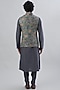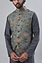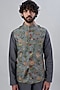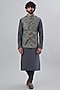Featuring a grey woven bundi jacket in silk base with hand painted print. It is paired with a kurta and churidar pants. Accentuate it with kolhapuris or embroidered juttis for an elegant yet easy-going look, perfect for pooja ceremonies or festive gatherings.