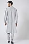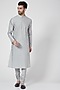 Featuring a light grey kurta in cotton silk base with tonal resham embroidery. It is paired with matching churidar pants.