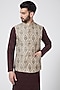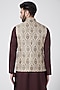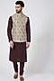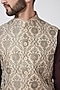 Featuring a sand colored waistcoat in raw silk base with kasab and applique work. This contains only one piece.