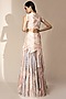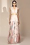 Featuring a blush pink skirt in net base with 3D leaf applique, resham, cutdana and bugle bead work, including draped embroidery. It is paired with a matching crop top.