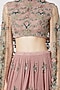 Featuring an old rose lehenga in georgette and tulle base with floral appliques, sequins, cutdana, and crystals embroidery. It is paired with a matching cape choli.