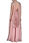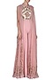 Featuring a pink sleeveless jumpsuit in georgette base with 3D laser cut in silk velvet applique work all over the bodice and attached pleated dupatta.