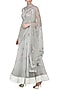 Featuring a sea blue anarkali in tulle and satin base with hand beading, cut work and 3D floral hand embroidery and an attached draped dupatta. It is paired with matching churidar pants.