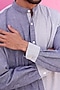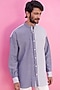Featuring a blue shirt in cotton base with chambray stripe panel, mandarin collar, drop shoulder and shell buttons detailing. This contains only one piece.