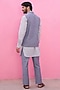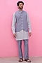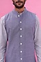 Featuring a blue bundi jacket in chambray cotton base with mandarin collar, shell buttons and placket detailing. It is paired with a contrasting striped kurta. This contains only two piece.