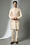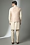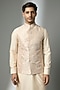 Featuring a beige bundi jacket in silk base. It is paired with a kurta and pants. Style it with statement brooch and mojaris. Perfect for wedding ceremonies, receptions, and grand festive celebrations.
