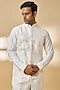Featuring a white bundi jacket in silk base. It is paired with a kurta and pants. Style it up with shoes for a wedding, sangeet or engagement ceremony.