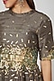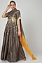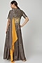 Featuring a grey floor length gown in raw silk base with an attached chinon shoulder drape and holographic sequins embellishment. This contains only one piece.