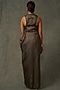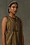 Featuring a light olive dress in kota silk and cotton tissue base with sequins and beads embellishments. It is paired with matching pants.