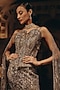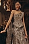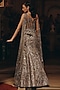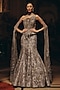 Featuring a grey and silver flared mermaid skirt in bemberg silk, satin and net base with sequins, beads and crystal hand embroidery. It is paired with an embroidered corset having an attached drape. Accentuate with diamond jewellery, a sleek bun and a crystal clutch bag for a cocktail, sangeet or reception ceremonies and ace the royal look.