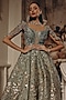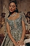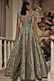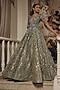 Featuring a sea foam green draped gown in satin, organza and net base with embroidery. Accentuate with diamond jewellery, a sleek bun and a crystal clutch bag for a cocktail, wedding or engagement ceremonies and ace the royal look.