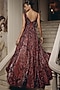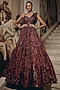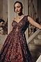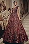 Featuring a wine gown in luxe satin, crepe and net base with sequins and crystal embroidery. Accentuate with diamond jewellery and heels for a wedding or engagement ceremonies and ace the royal look.