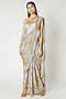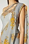 Featuring a grey draped saree in modal satin and viscose georgette base with yellow floral print including resham, kadhana and sequins embroidery. It is paired with a matching one shoulder blouse.