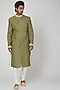 Featuring an olive green sherwani in textured and spun silk base with collar embroidery and floral print. It is paired with contrasting white churidar pants.