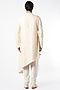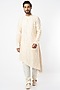 Featuring a pale yellow flared kurta in art dupion silk base with zari, thread, and floral jaal embroidery. It is paired with off white cotton silk churidar pants. Perfect attire for festive occasion or haldi ceremony, exuding traditional charm and elegance.